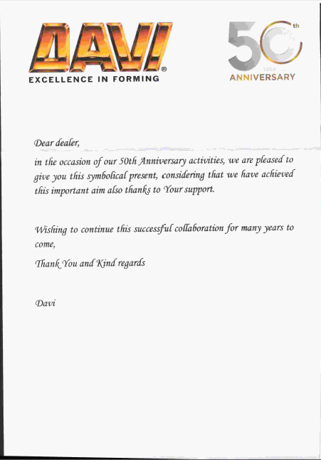 50年砥礪前行,50年春華秋實。2016年10月,將迎來Davi公司建廠50周年的喜慶日子。為了熱烈慶祝Davi建廠50周年,Davi公司特邀全球代理商和客戶前往意大利參加50周年慶典,我們蘇州哈利機(jī)械設(shè)備有限公司作為意大利Davi在國內(nèi)代理商將會榮幸受邀參加!